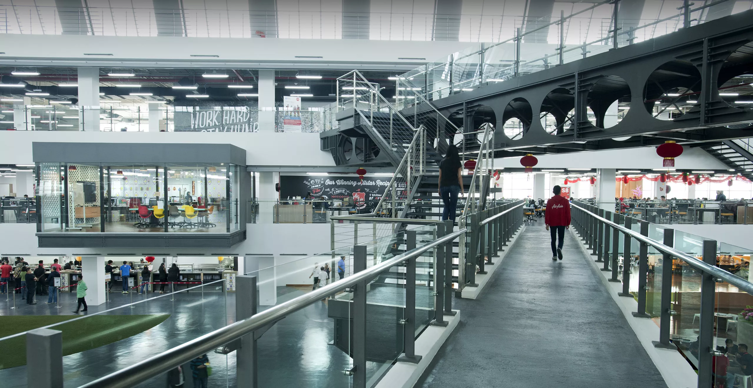 The building’s form and massing become key drivers for energy performance. Naturally lit atria, which the building’s open plan is organized around, form visual and physical connections across levels, enhanced by interconnecting bridges. This feature of the design reflects AirAsia’s culture of openness and collaboration. In addition, the facade strategies are carefully considered to optimize natural ventilation, minimize solar exposure, and maximize operational efficiency. Internally, vertical green walls further improve indoor air quality and bring warmth to the expansive workspace.