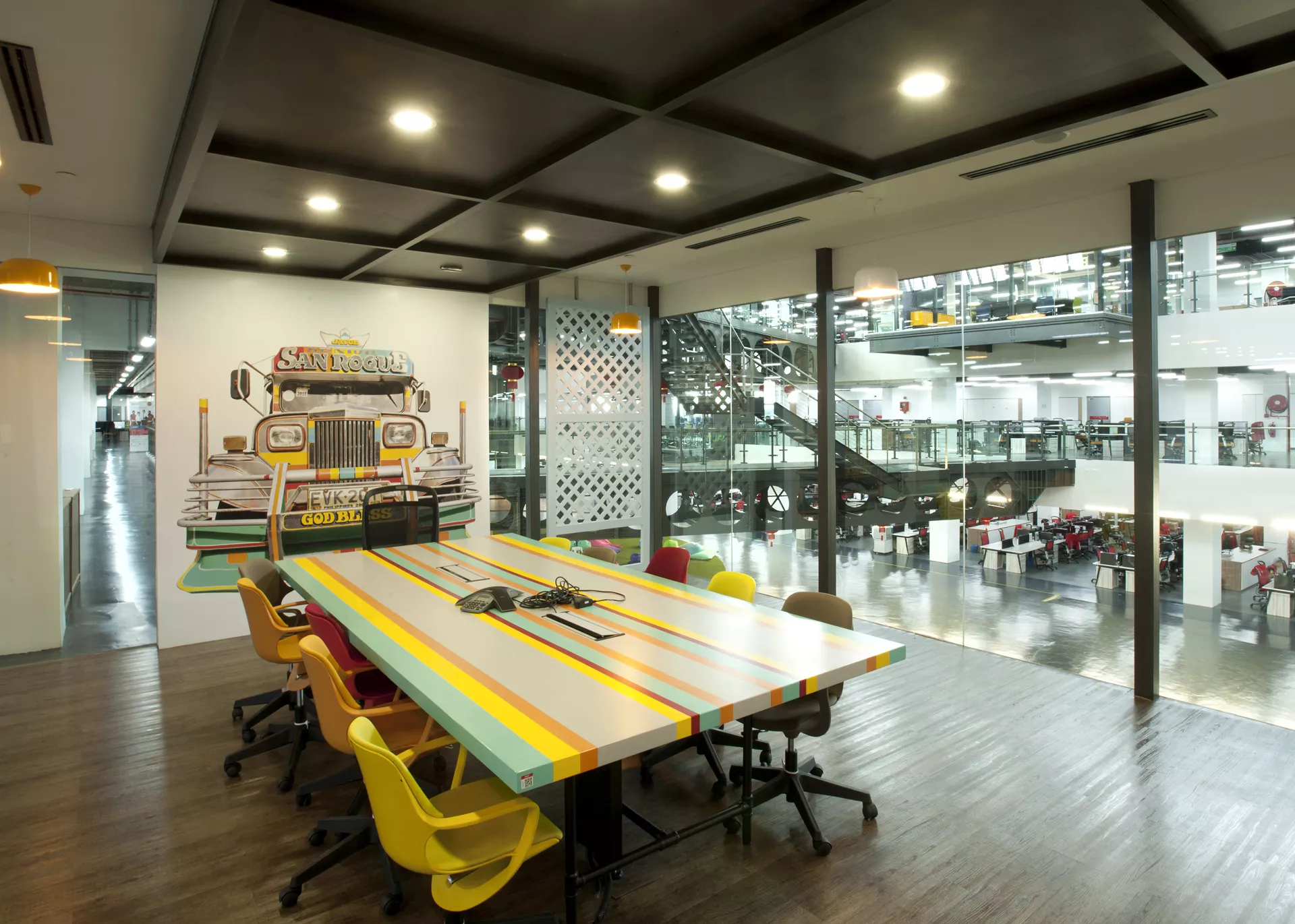 The interior design takes the center for a contemporary, energy-efficient environment. The design merges industrial aesthetics with striking color schemes and graphic brand motifs to promote a sense of energy, inclusivity, and creativity. The rectangular building is structured around light-filled atriums that impart an invisible order to the open floorplans, outfitted with modern ergonomic furniture, flexible seating zones, and layered lighting—all designed to support comfort and productivity.