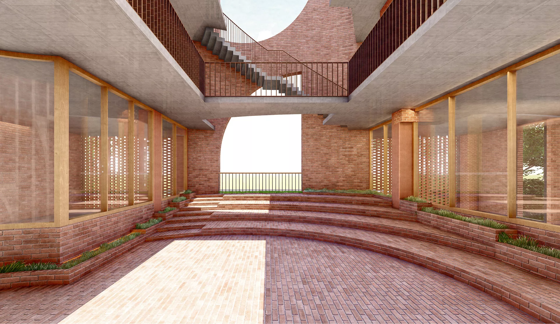 The natural forces of water and air flowing from the Himalayas through Bangladesh play a significant role in architectural design, particularly in maximizing ventilation and creating a healthy environment. The design of the old age home building has been oriented along the north-south axis to ensure maximum cross-ventilation. Perforated mesh bricks additionally help facilitate natural airflow throughout the structure. The design, characterized by curved perforated brick walls, symbolizes openness, warmth, and a seamless connection between past and future generations. The permeable walls allow natural light and airflow, creating a tranquil and breathable living environment.