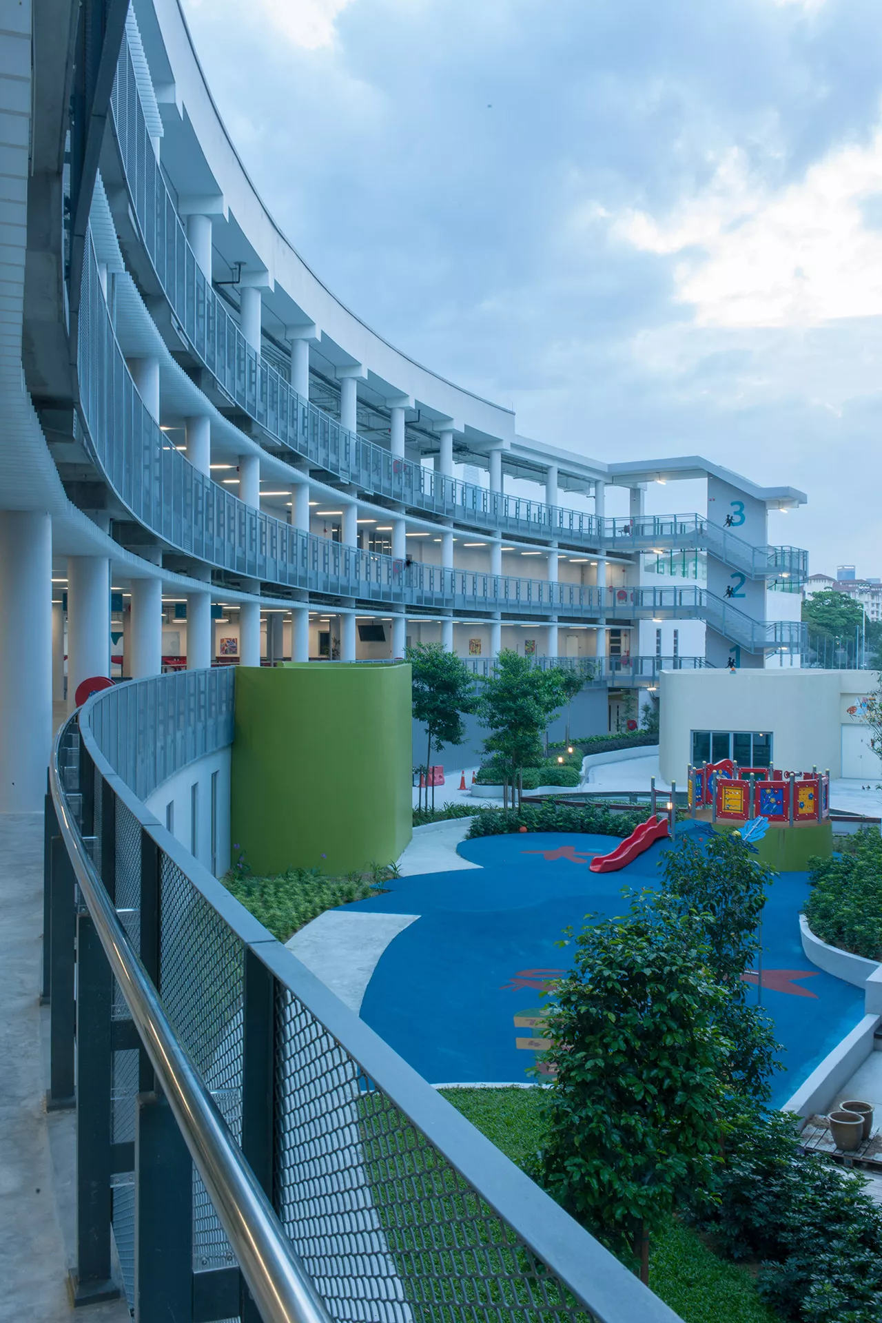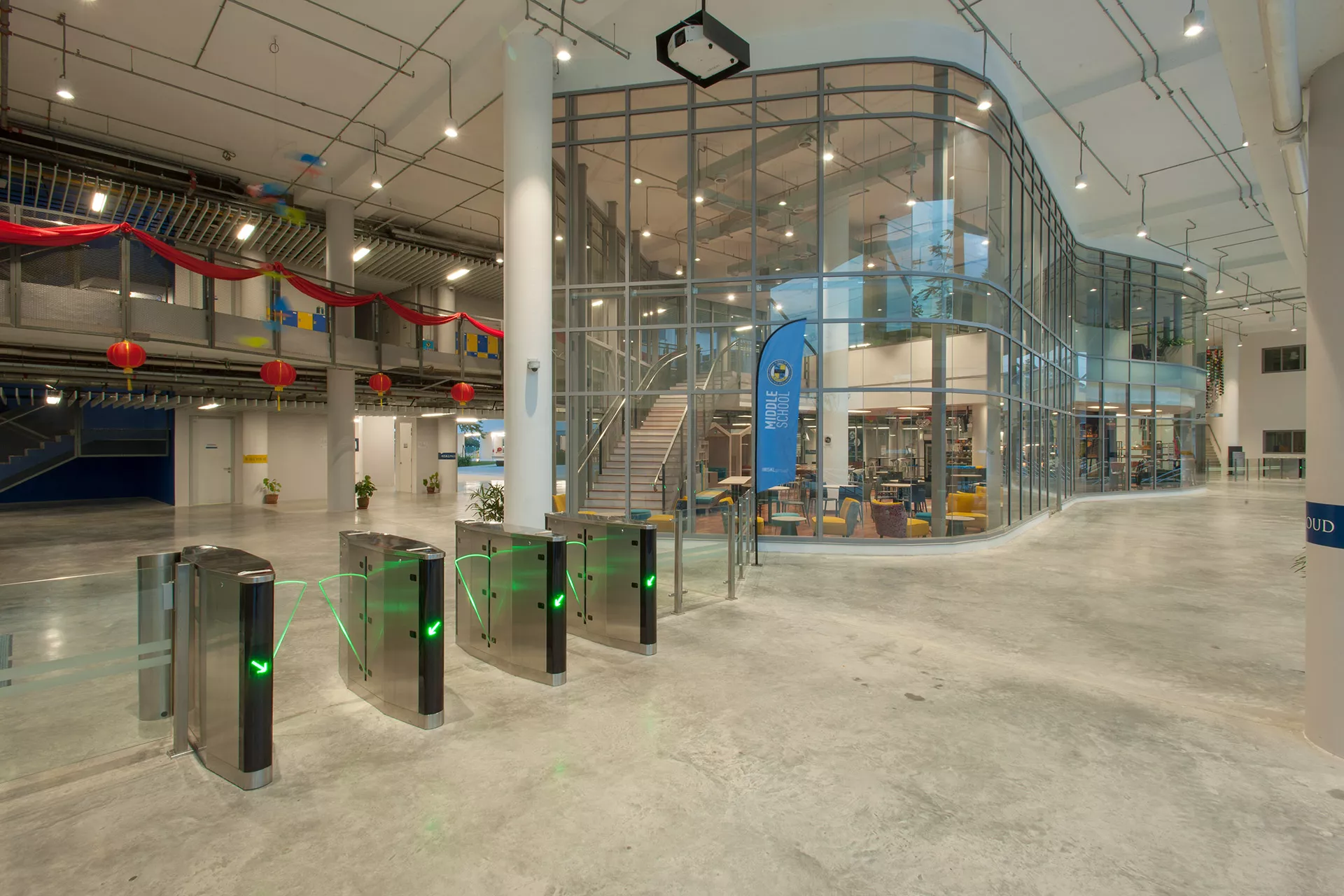 ISKL, located on an 11.8-hectare site, brings together its elementary, middle, and high school divisions within a unified, future-ready campus. Comprising five blocks of 5-storey buildings, the campus includes a dedicated performing arts centre, underground parking, and a wide range of academic and sports facilities—such as two gyms, Olympic and training-sized swimming pools, three football fields, tennis and badminton courts, and science and arts labs—all connected by a curvilinear circulation spine. At the heart of the campus lies a central plaza and the Performing Arts Centre, conceived as a vibrant communal and cultural hub.