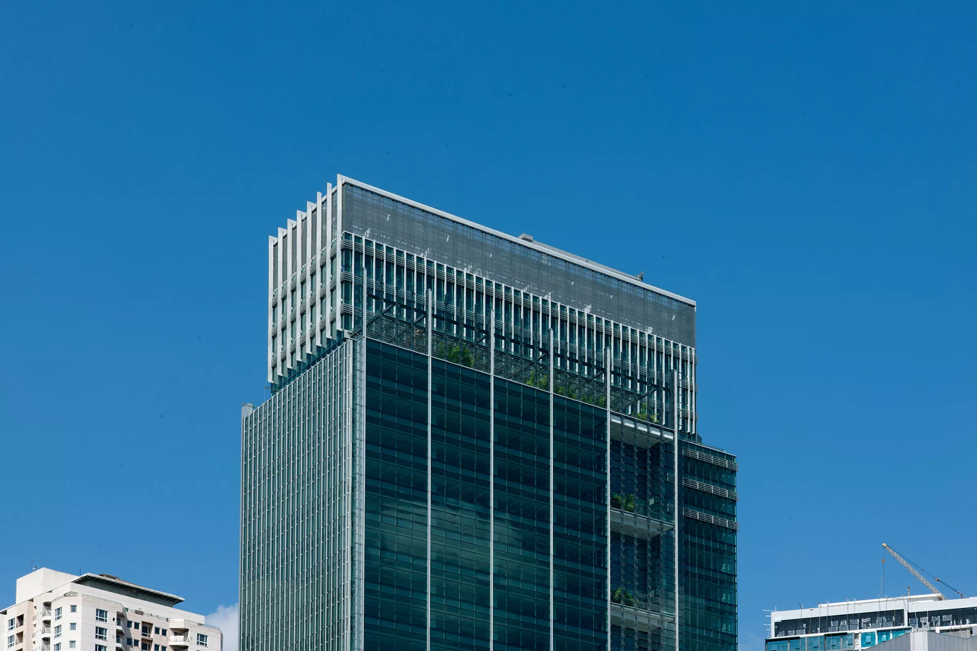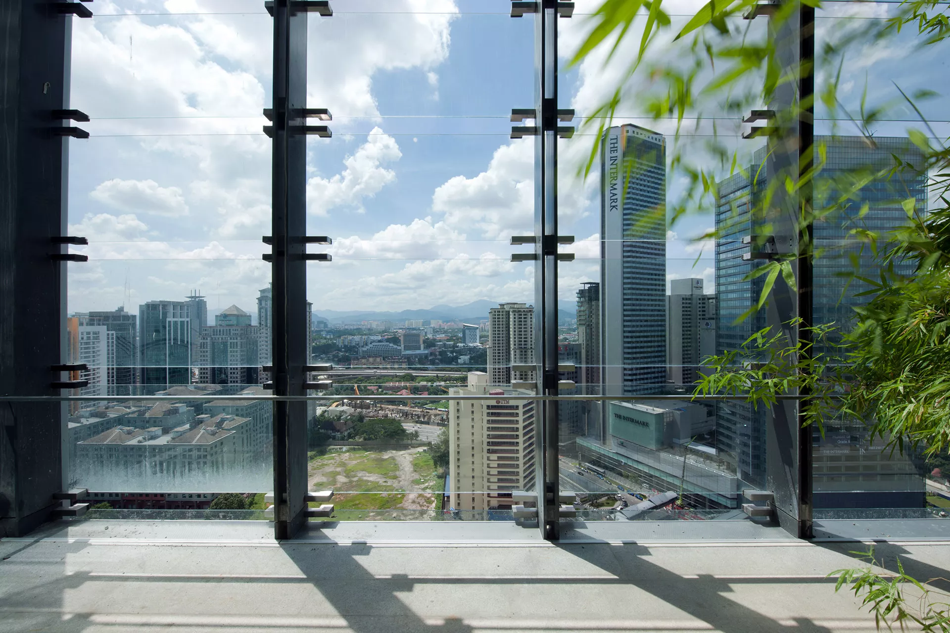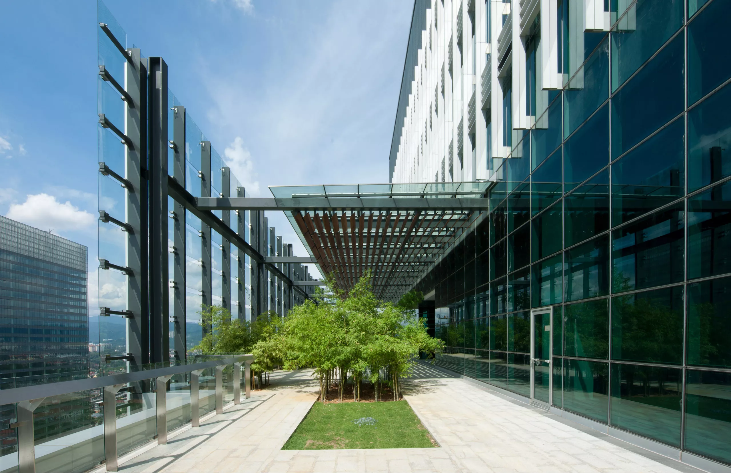 Energy efficiency is embedded through deep vertical fins for sun-shading, low-e double glazing, and the integration of passive design strategies. The building has achieved dual green certifications: Malaysia’s Green Building Index (GBI) and Singapore’s BCA Green Mark Gold.