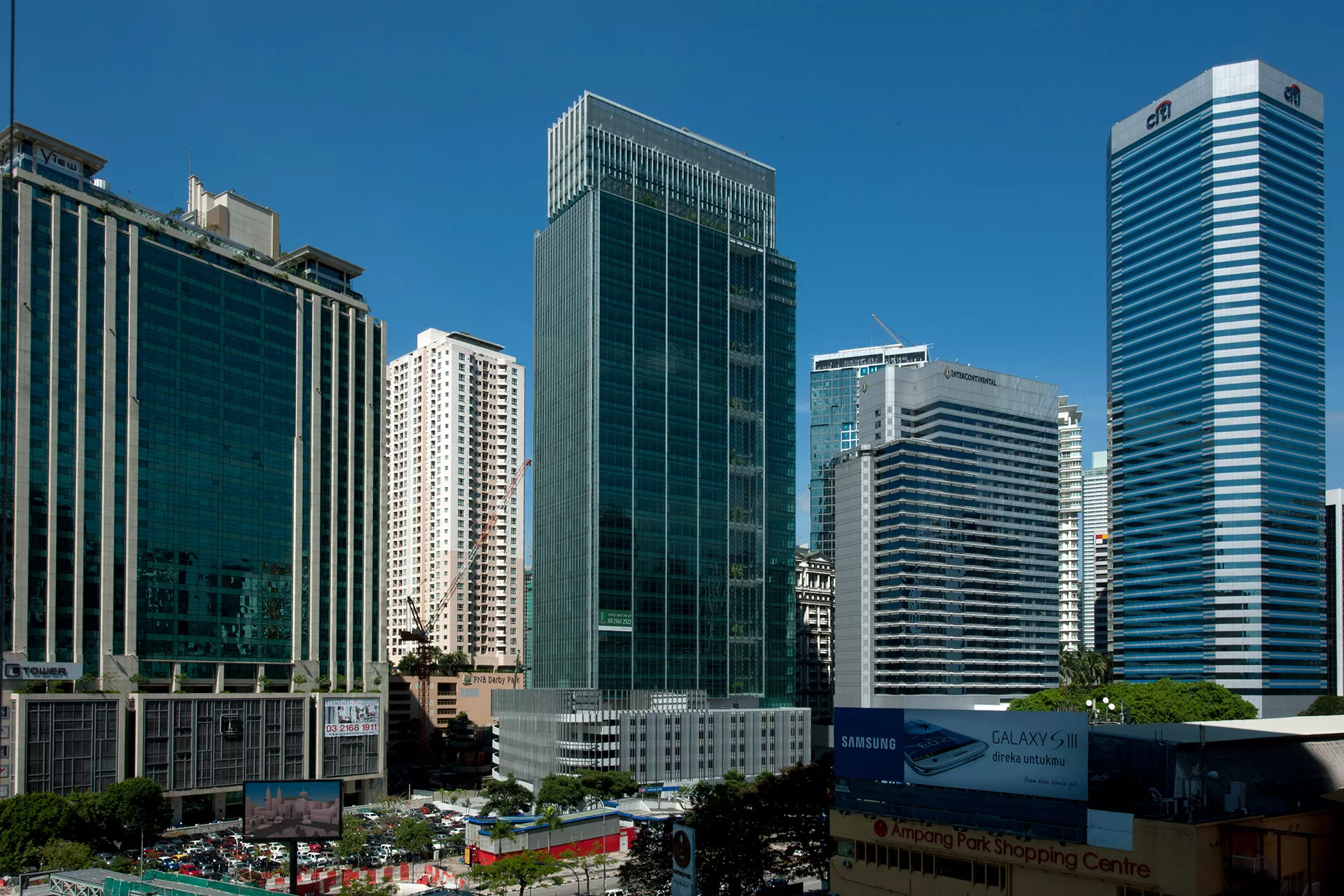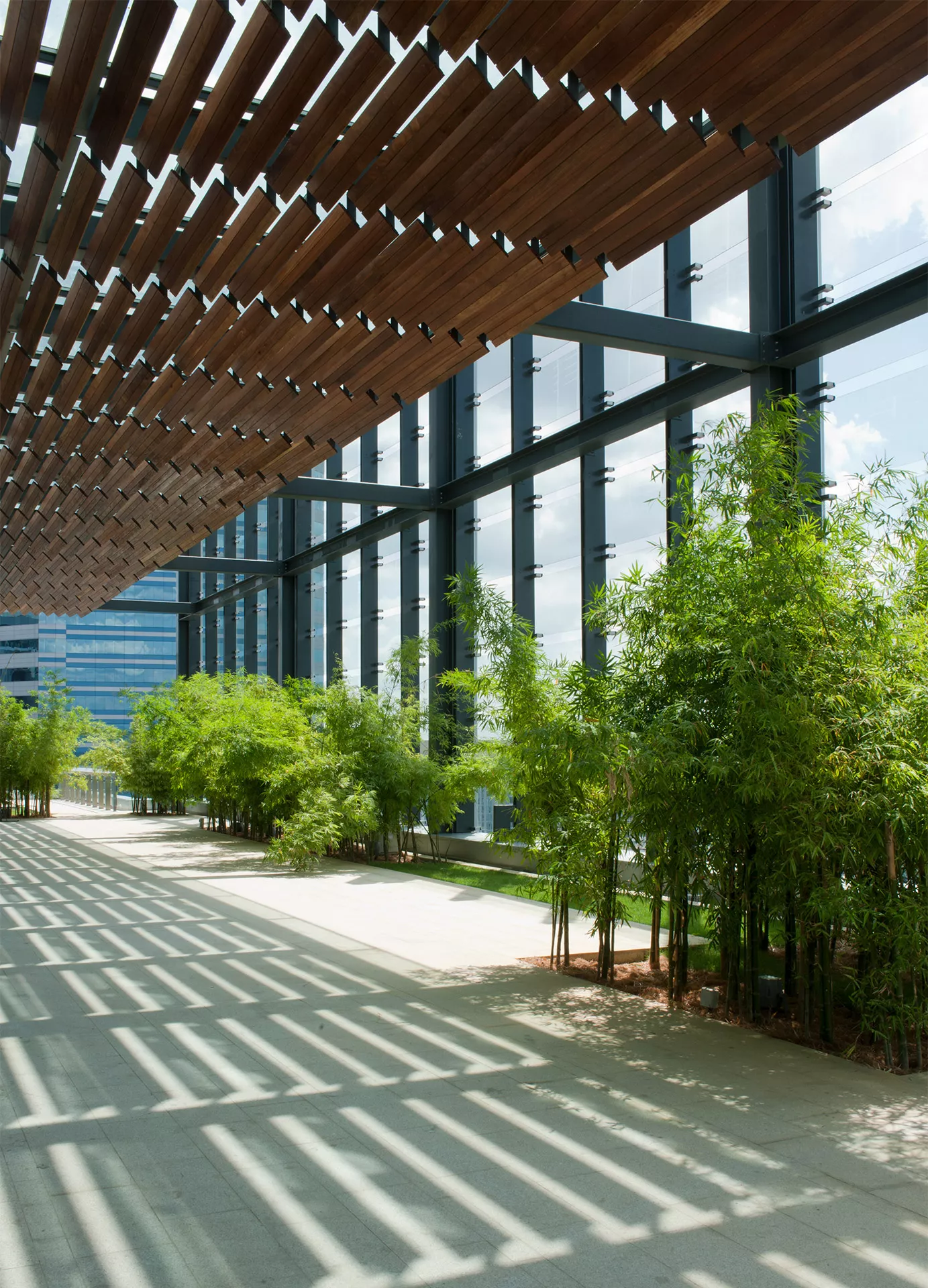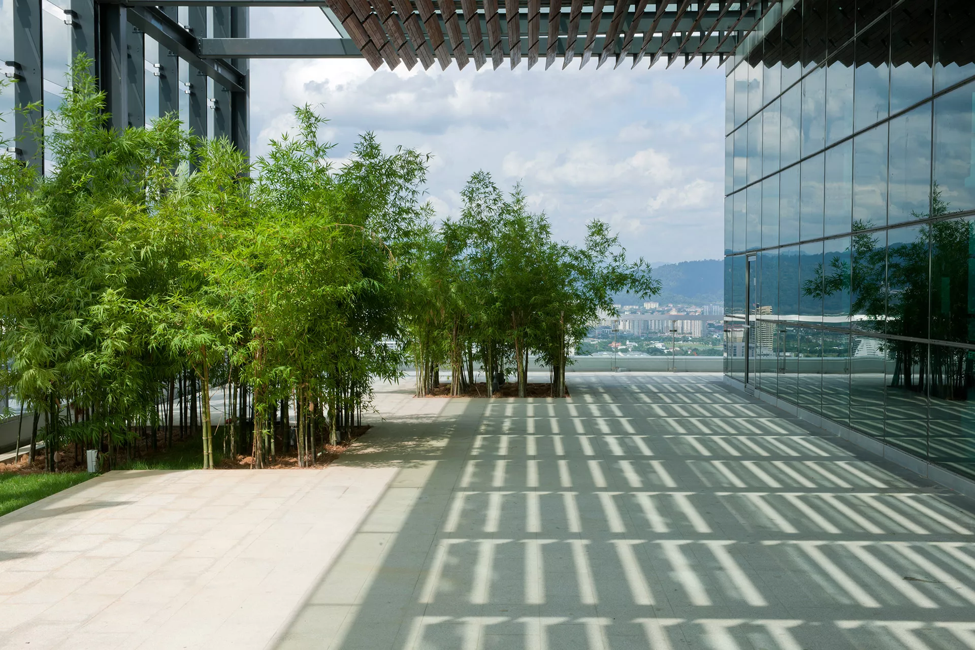 Energy efficiency is embedded through deep vertical fins for sun-shading, low-e double glazing, and the integration of passive design strategies. The building has achieved dual green certifications: Malaysia’s Green Building Index (GBI) and Singapore’s BCA Green Mark Gold.