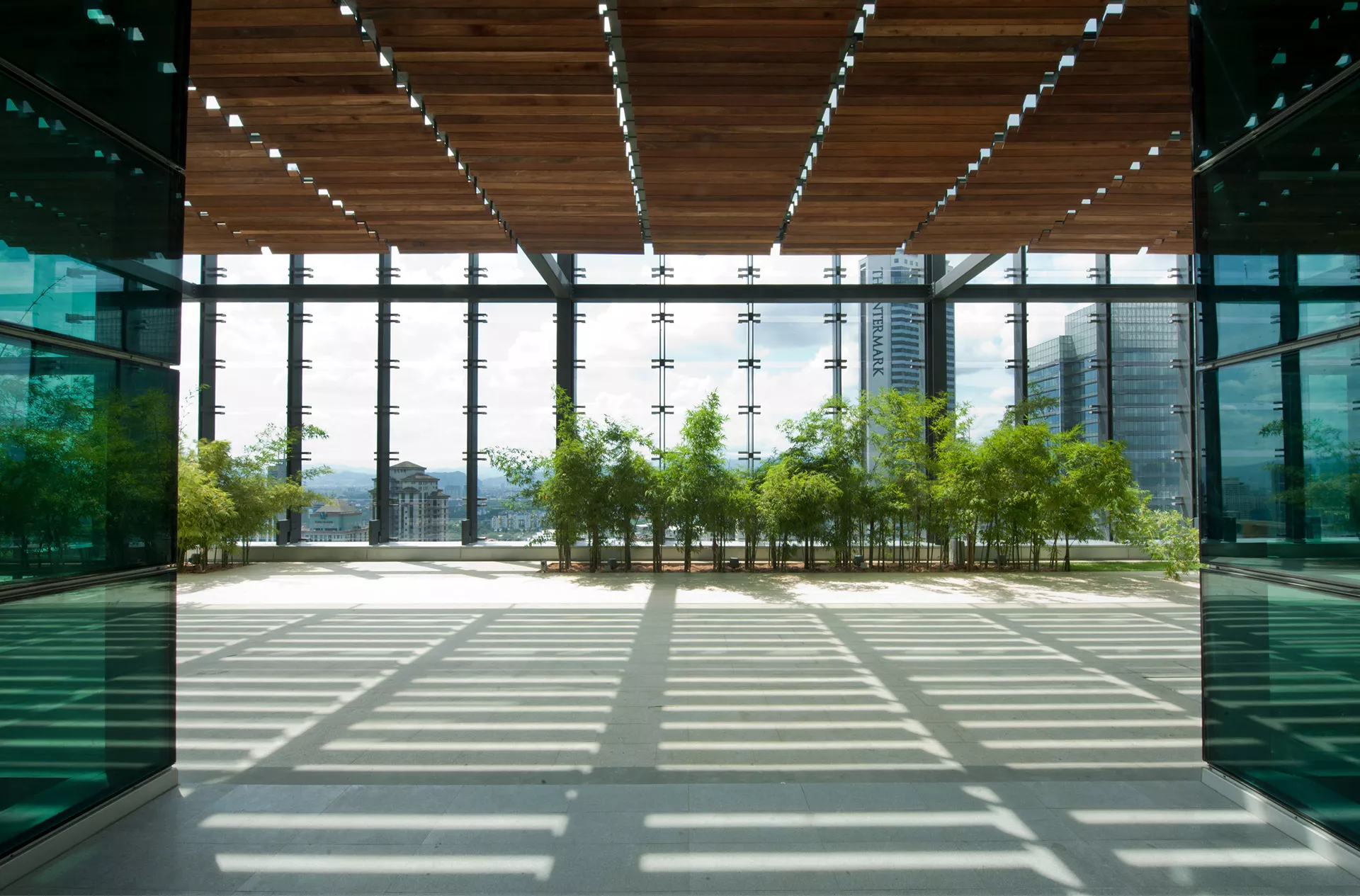 The tower’s signature design features a series of triple-volume sky gardens cascading up the north-facing façade, culminating in a lush rooftop garden that opens to panoramic views of the KLCC skyline. These sky gardens are enclosed by a permeable glass screen — an innovative “breathable skin” that allows prevailing breezes to flow through while buffering against monsoon rains. This creates a semi-outdoor “urban verandah,” allowing occupants to engage with the tropical climate, in contrast to conventional sealed office environments.