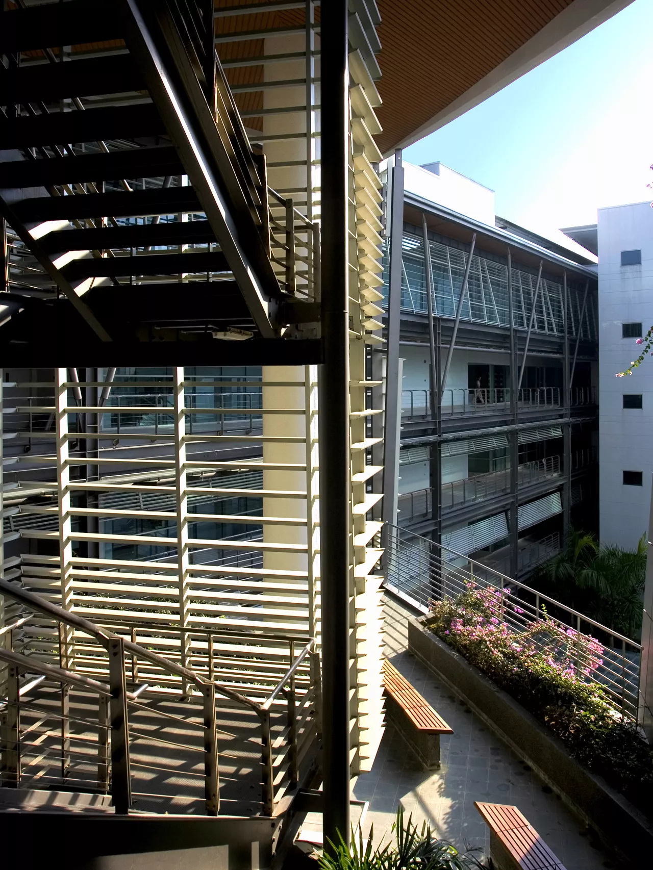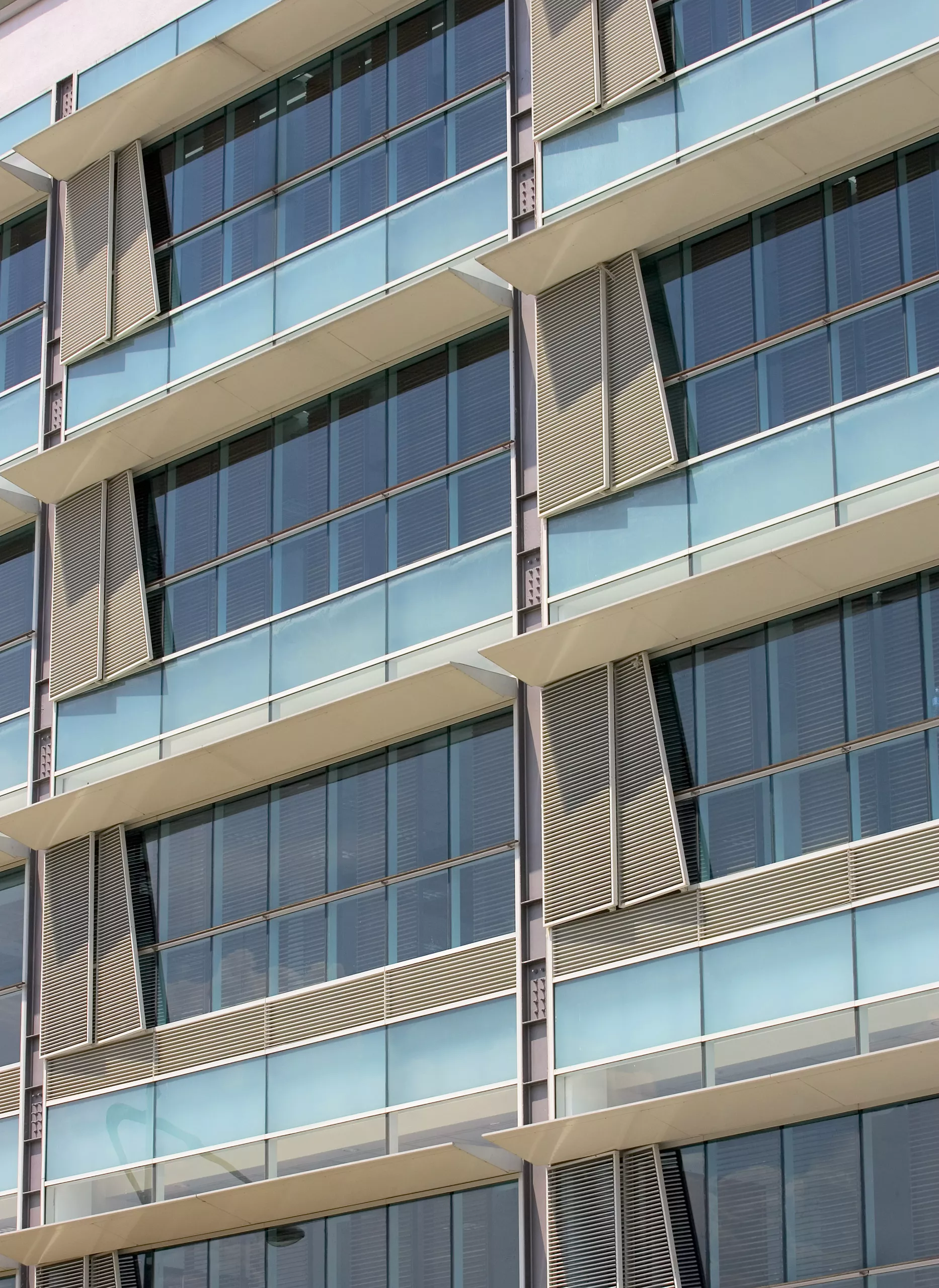 The design is anchored by an 18-storey elliptical tower rising from a 6-storey podium, a form deliberately oriented along the north–south axis to minimize heat gain. This geometry, bold yet disciplined, lends the tower a calm presence along the Central Boulevard while subtly echoing the fluidity of Islamic patterning. Meanwhile, building orientation influences the shading strategies. A finely calibrated brise-soleil shields the west façade from the harsh afternoon sun, while terraced sky gardens on the east capture the gentler morning light and bring greenery deep into the workplace.