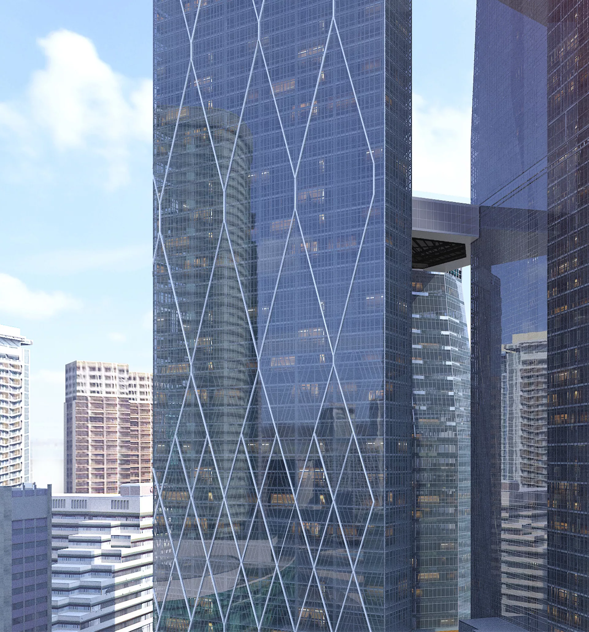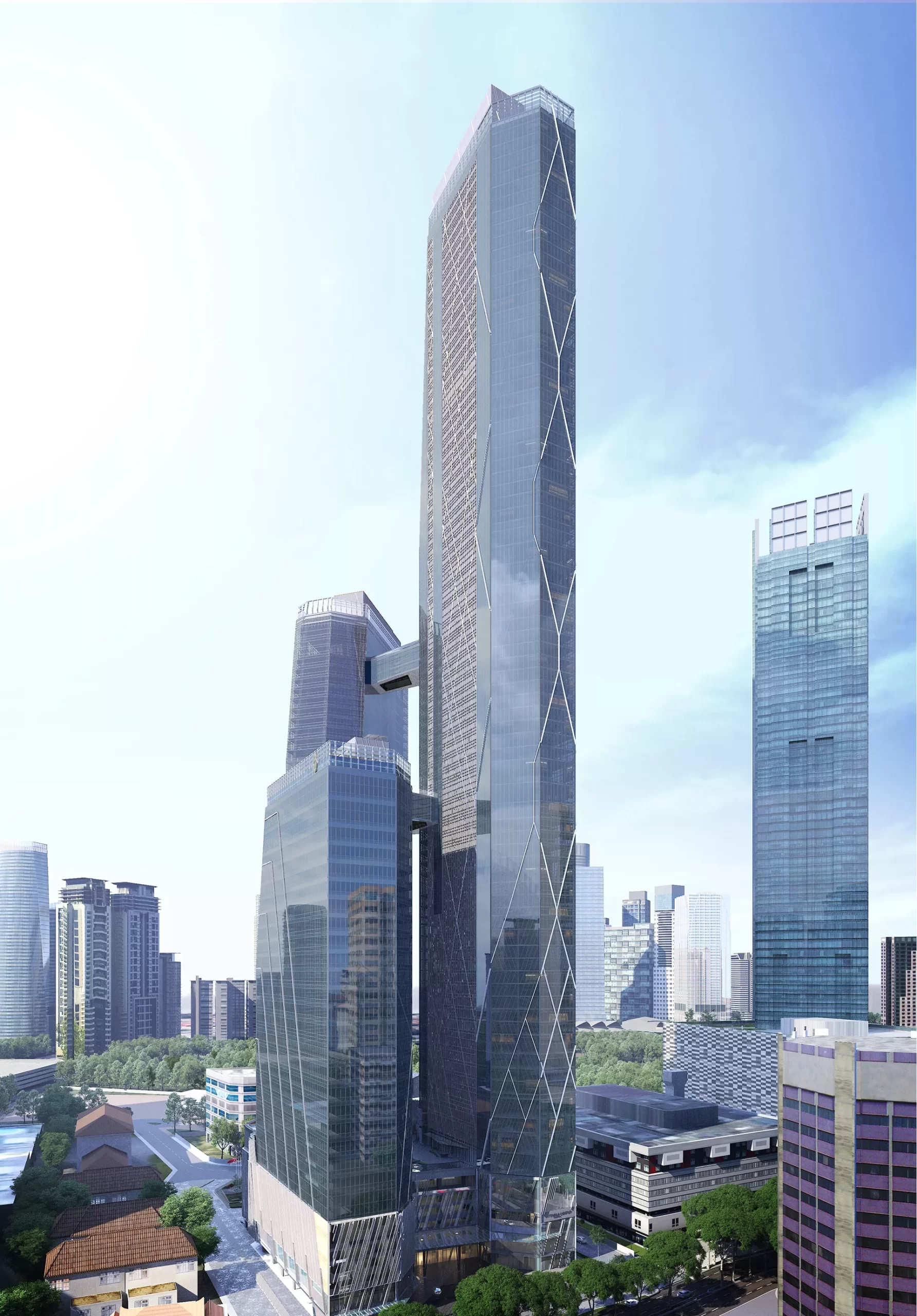 The towers’ facades feature a distinctive diagonal motif inspired by Malaysian weaving traditions, expressed through sun-shading fins and layered glazing. These textured curtain walls animate the towers’ form, creating a constantly shifting profile from every angle. More than a commercial precinct, Oxley Towers is envisioned as a civic destination—offering public connectivity, cultural resonance, and architectural presence in the evolving KLCC landscape.