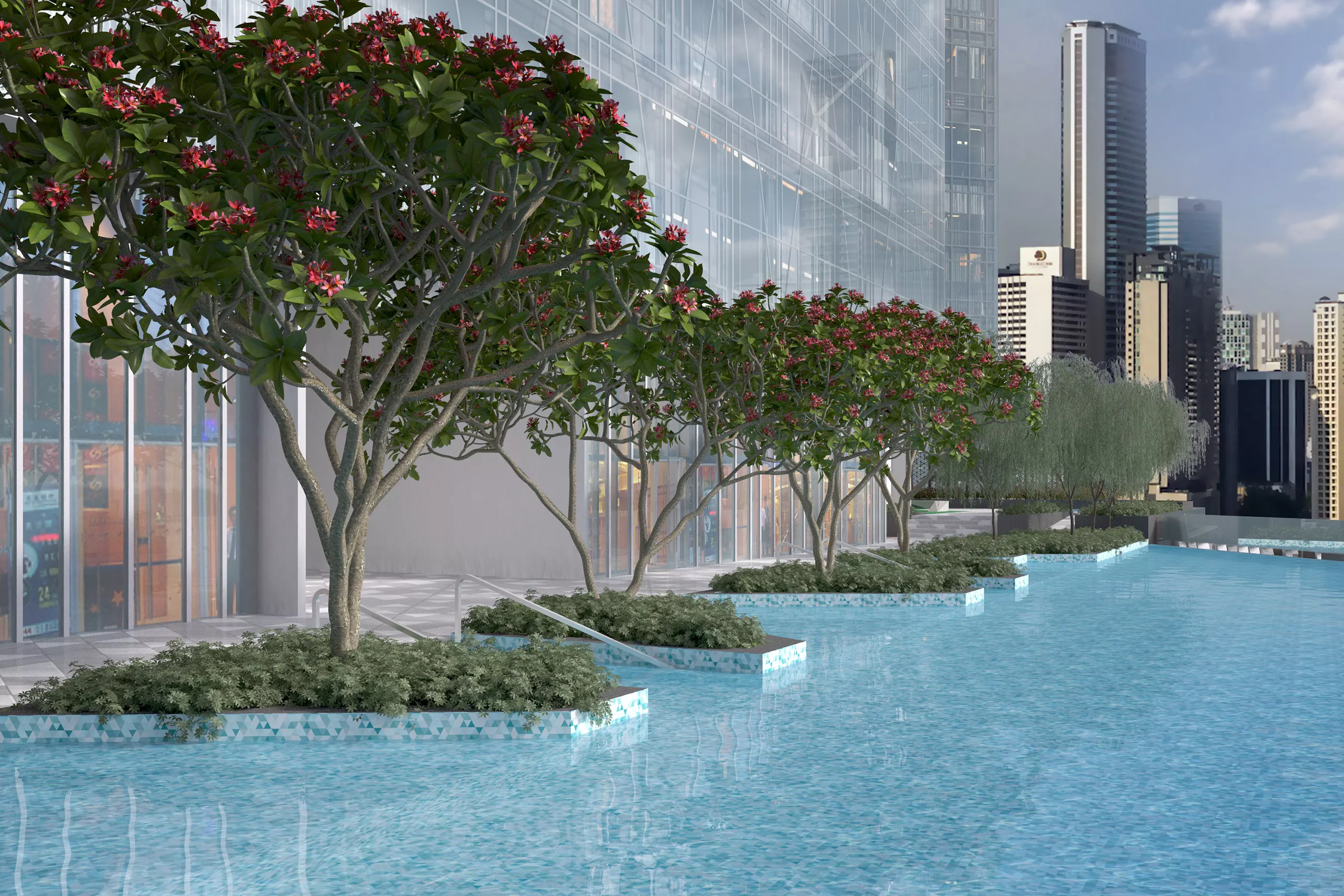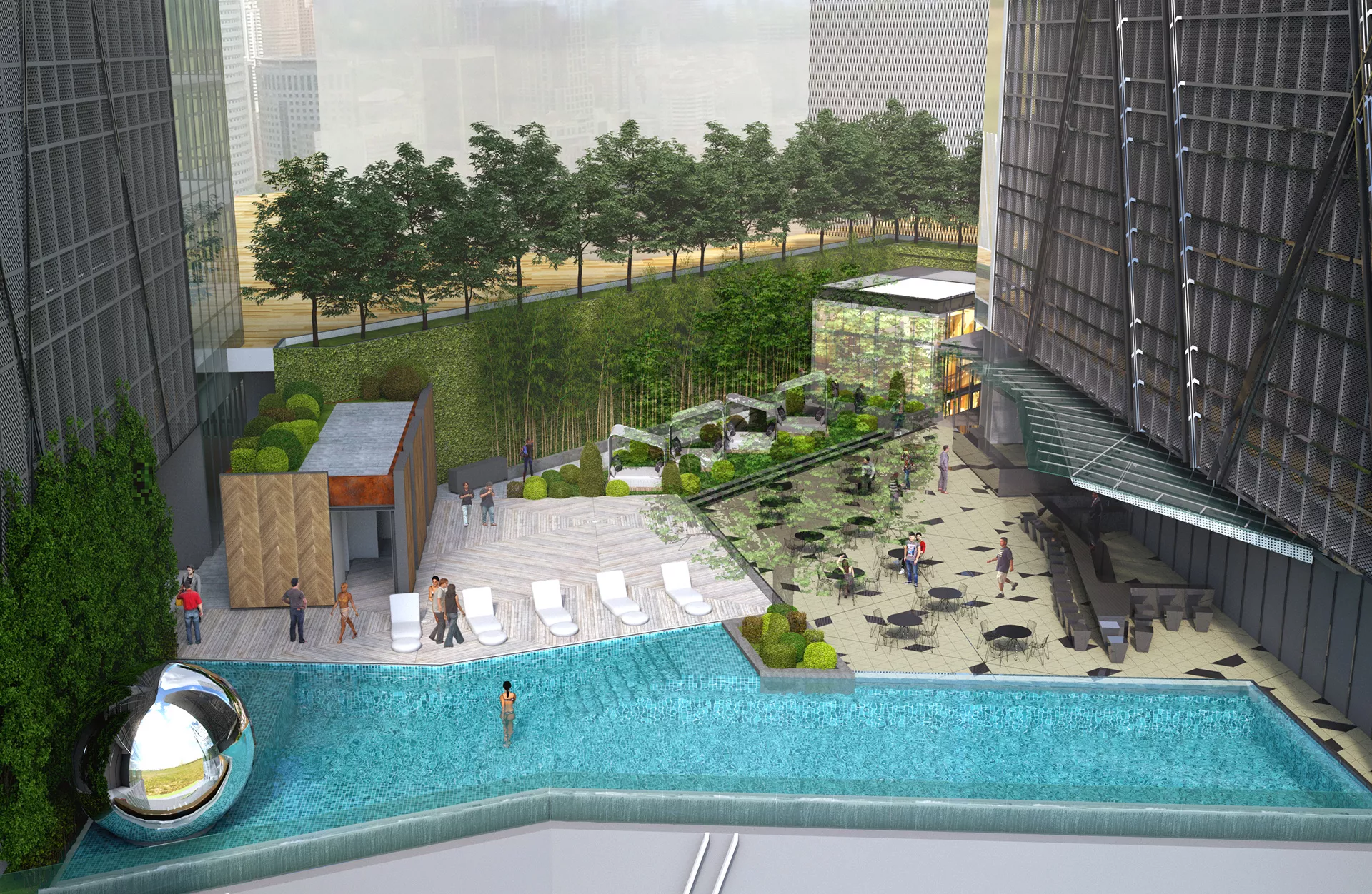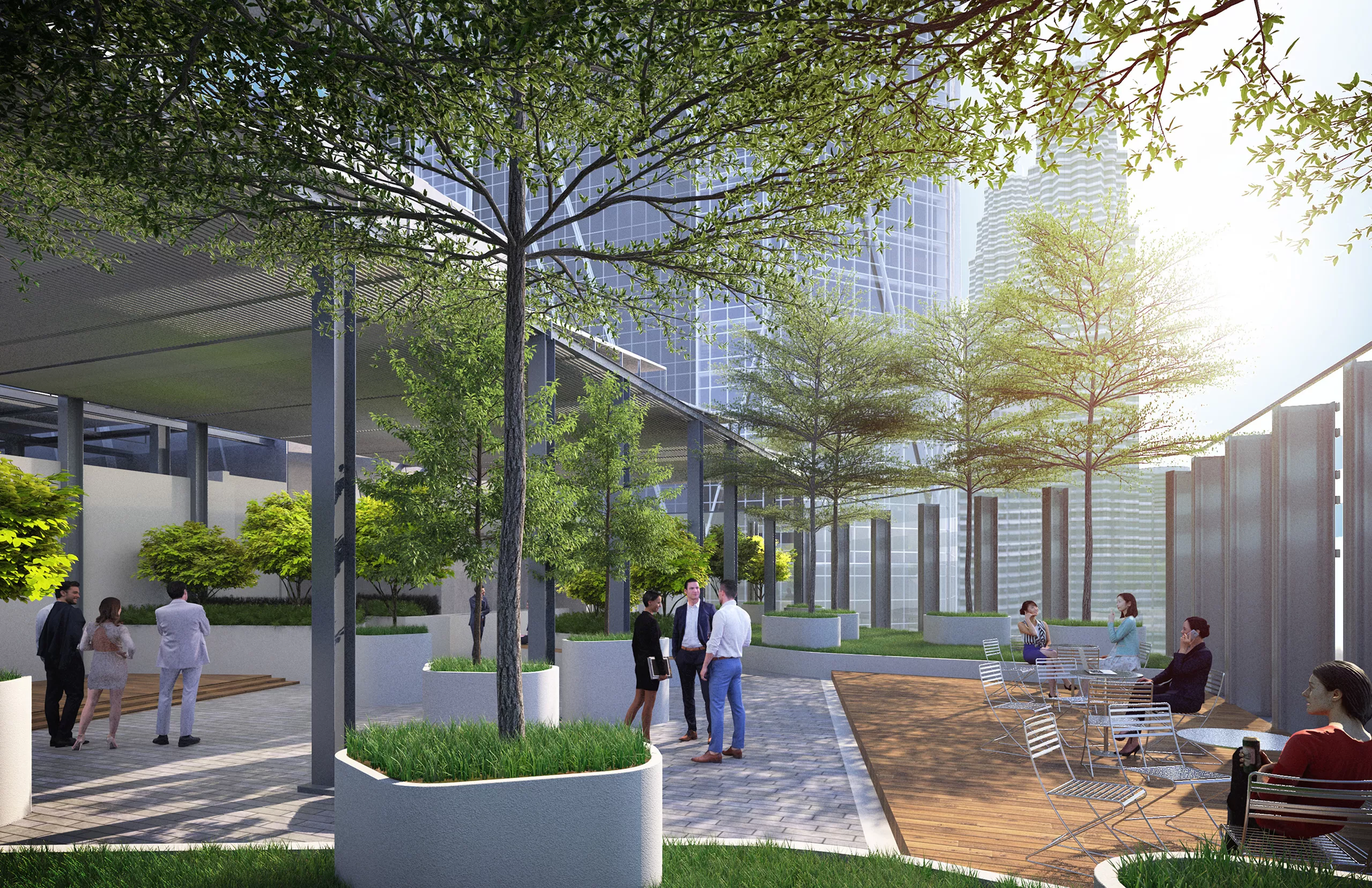 In addition to architectural design, VERITAS also provided a comprehensive landscape consultancy service for the Oxley Towers. The project includes a two-storey retail galleria, a 29-storey strata office tower, the 78-storey So Sofitel luxury hotel and serviced residences, and the 49-storey Jumeirah luxury hotel and serviced residences. The landscape design aims to complement the dynamic urban environment of Kuala Lumpur’s city center, promising a landmark destination that integrates retail, business, hospitality, and residential components within a cohesive landscaped setting.
