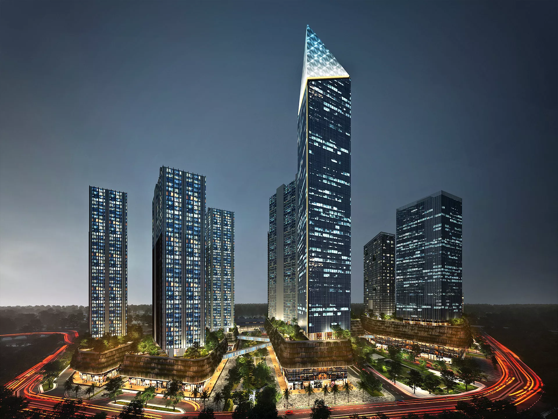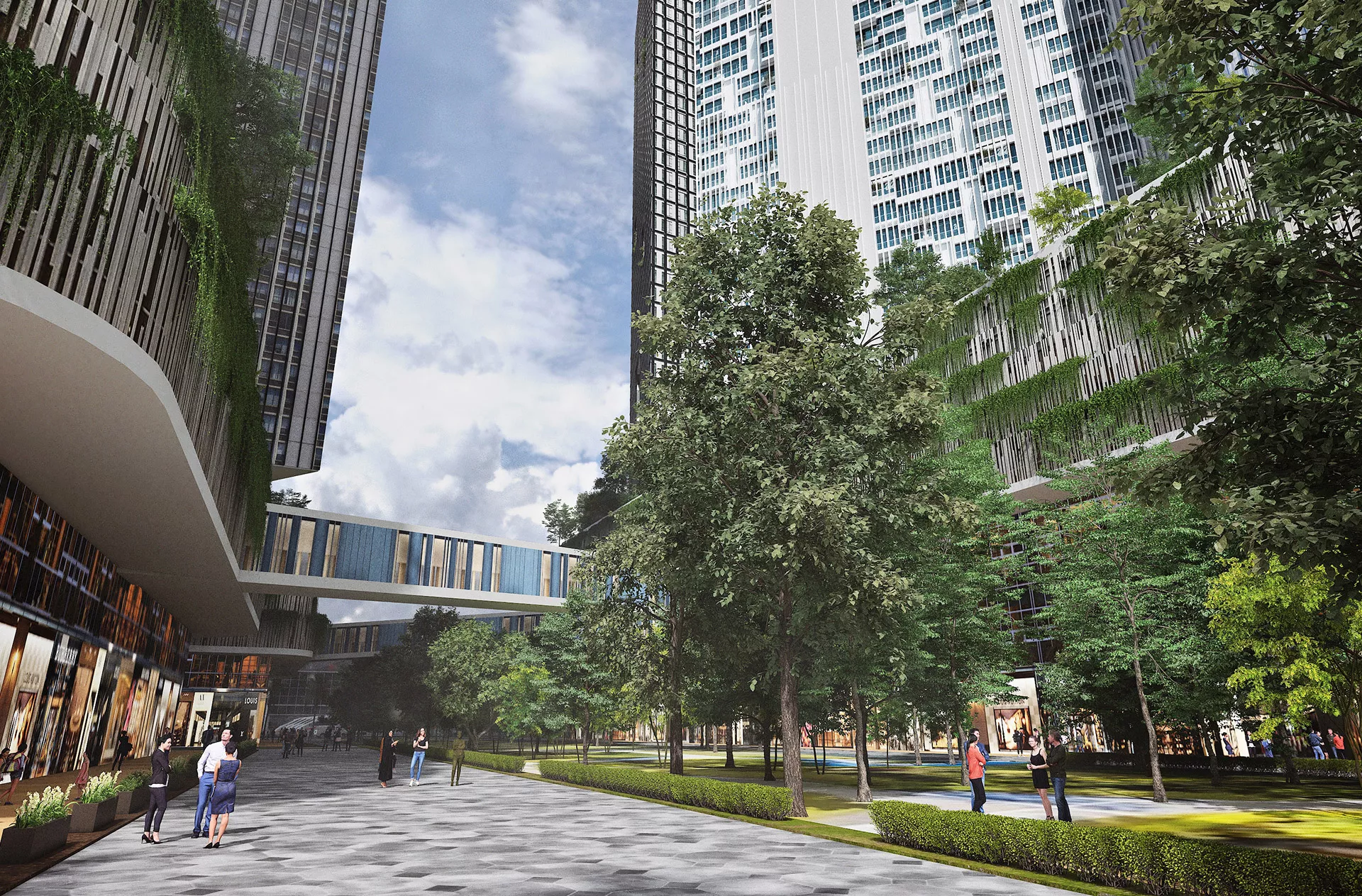 The masterplan seamlessly integrates world-class retail, dining, and residential spaces thoughtfully designed for convenience and modern living. A centralized green park anchors the development, complemented by smaller pocket parks to provide gathering spaces for community interaction and activities. At the same time, pedestrian-friendly pathways and elevated link bridges enhance accessibility throughout the development and beyond.
